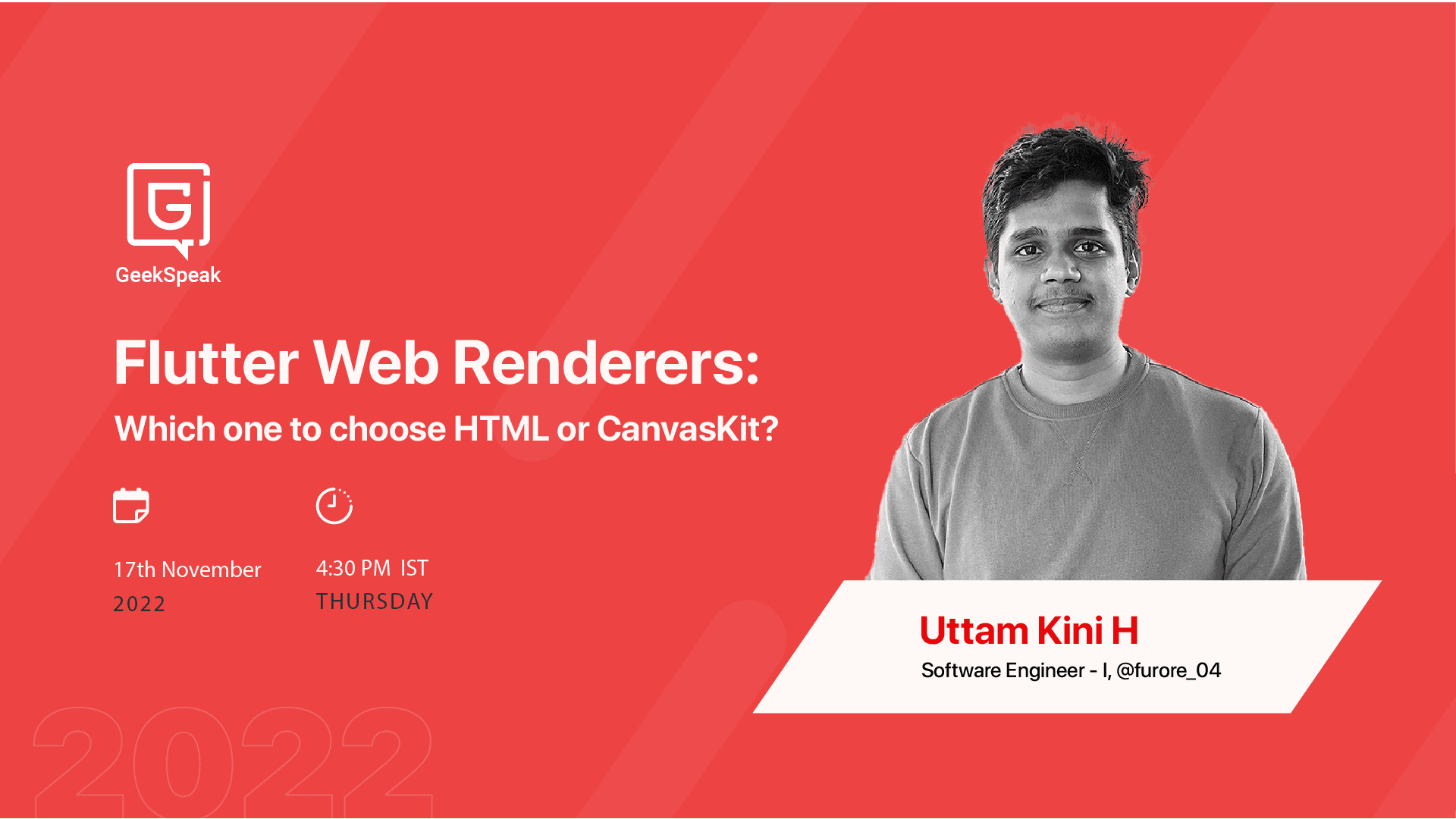 Rendering refers to the process through which, your code gets converted into intractable elements on a web-page. When using Flutter, for your web apps, you have two options, when it comes to web renderers: CanvasKit and HTML. In this episode of GeekSpeak, Uttam Kini, Software Engineer - I, talks about both, to help you select one between the two.