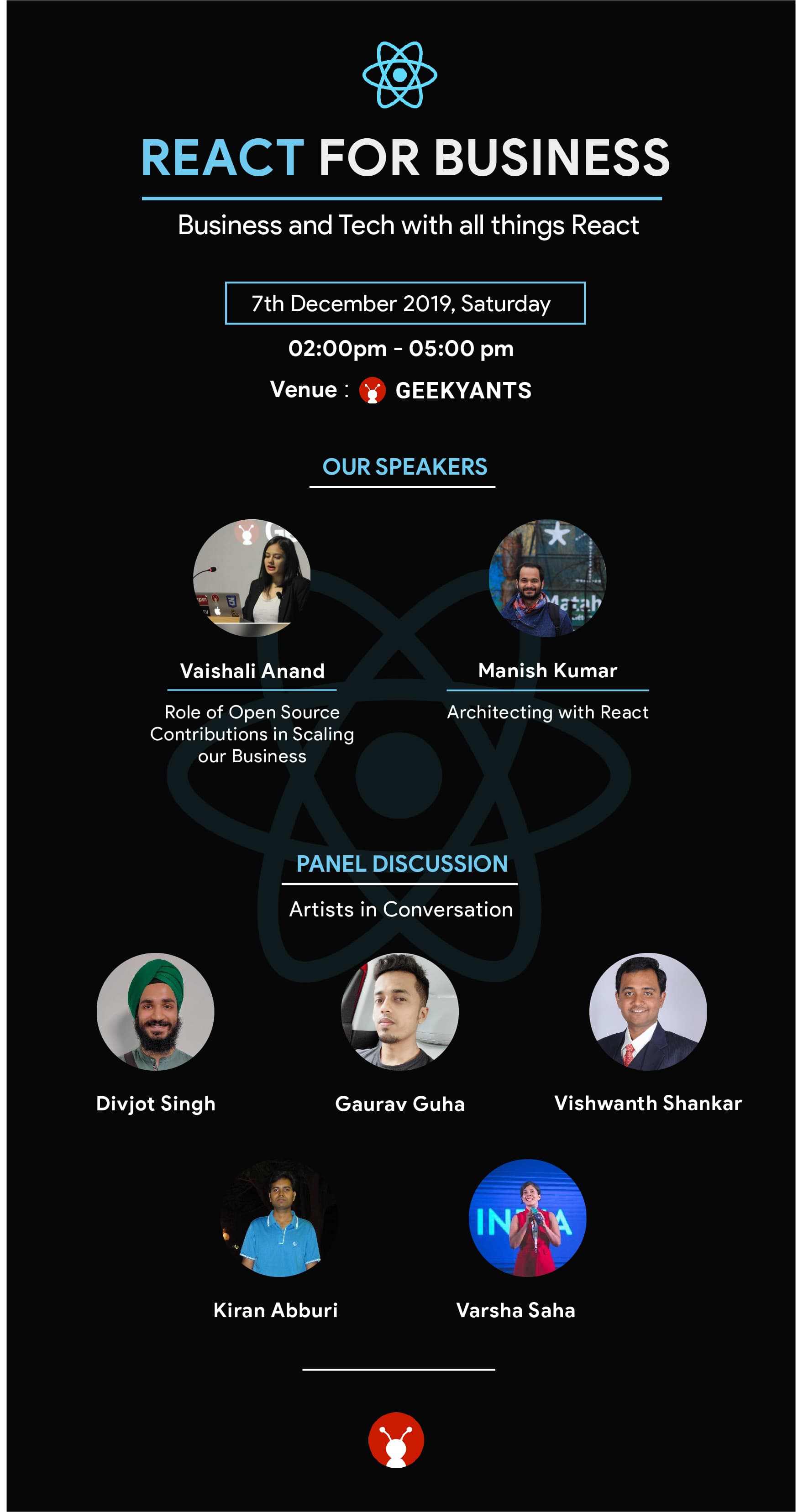 Our very first Tech & Business meetup i.e "React for Business" was a great success. The meetup covered the business aspects of React & React Native & it's future. Meetup video coming out soon.