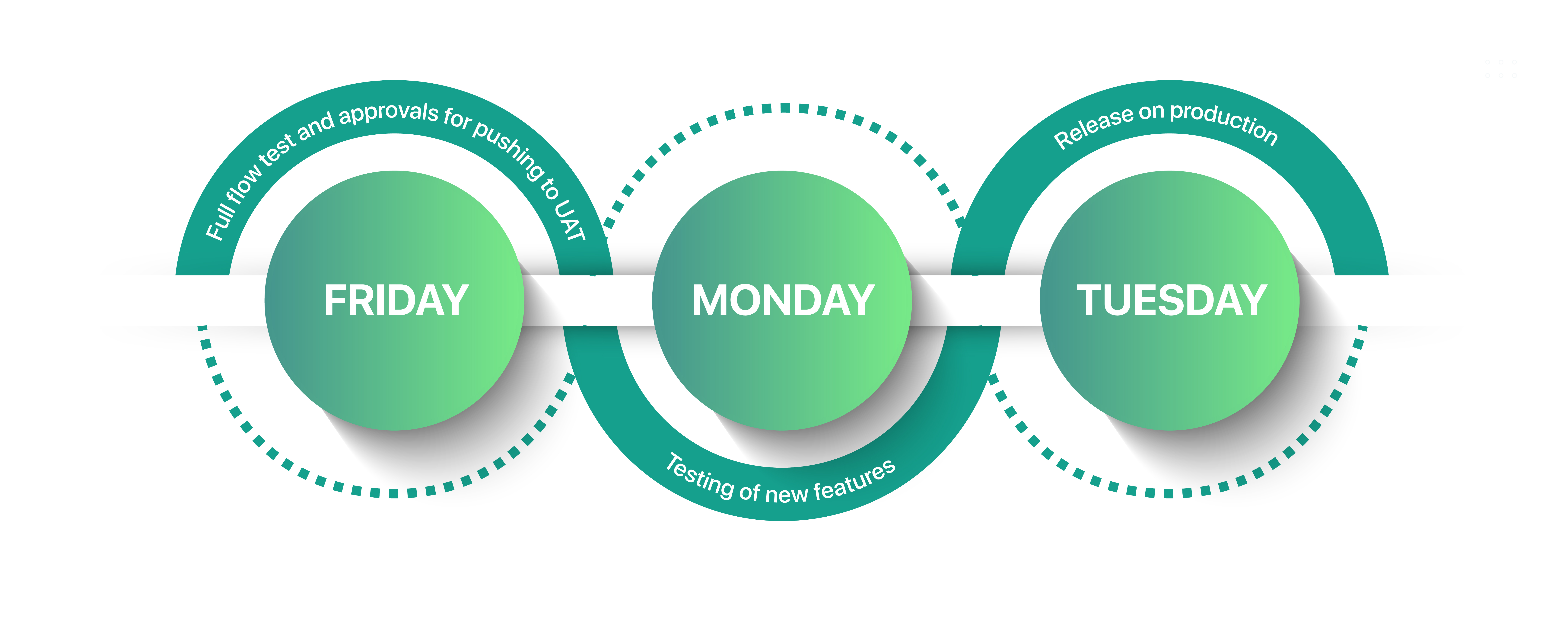 Agile Development. Time and Material Method. Strict Quality Tests.
