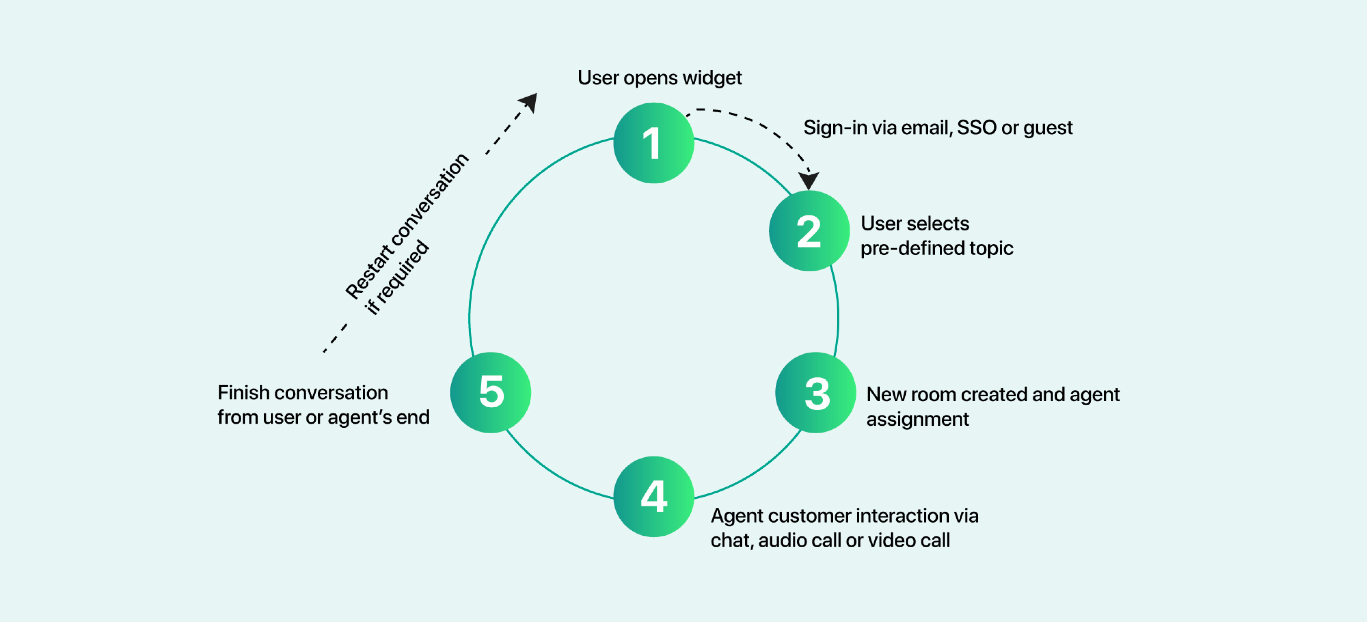 When a room is created by the consumer, the agent gets a notification to enter the room. On entry, the agent will receive all the sign-in info the consumer shares, along with a unique ID. The agent can then follow a predefined flow for interaction.