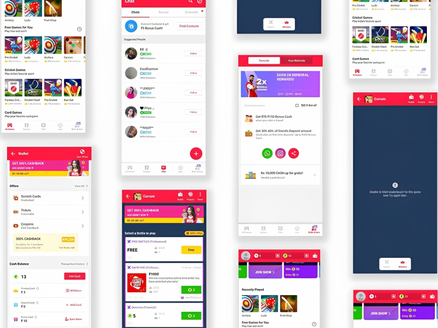 With the UI and integration process running in tandem, the first set of screens and features delivered were the essential welcome modules, event and winners module, wallet features for secure transactions and leaderboards. MPL promised a whopping 60+ live games on their platform at launch, and the dev team was tasked with making sure that the platform is robust and scalable, enough to handle the number of players that were expected to be engaged with the app at a particular time. Handling these APIs was quite a task and keeping these things in mind, the registration flow, user management, referral modules, payment gateways and chat rooms/lobbies for players were designed.