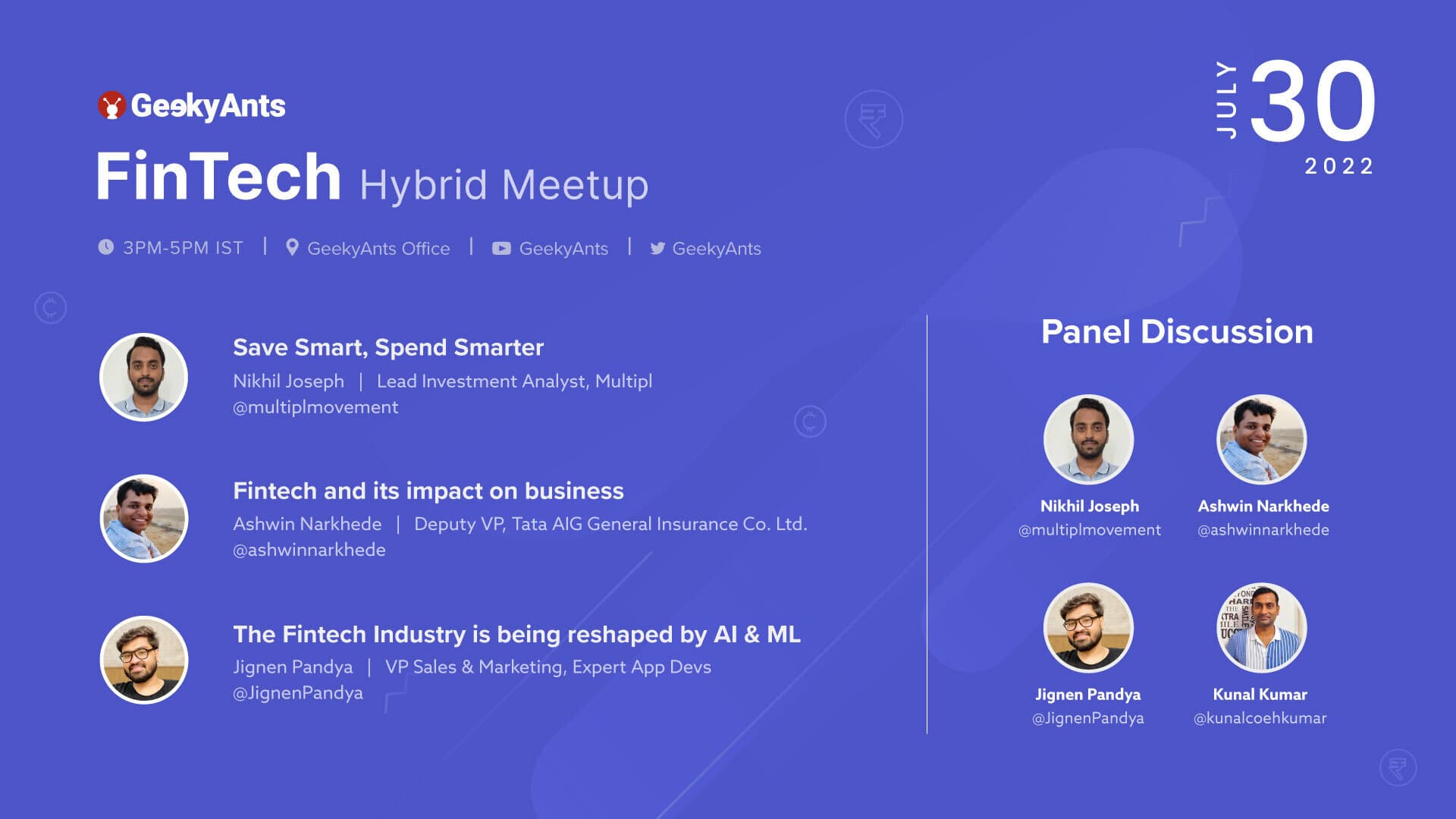We're hosting our very first Fintech Hybrid Meetup on 30th July 2022 at the GeekyAnts office in Bangalore. The day will be packed with amazing talks related to finance, tech, and everything in between. Join us by tapping on the poster above.