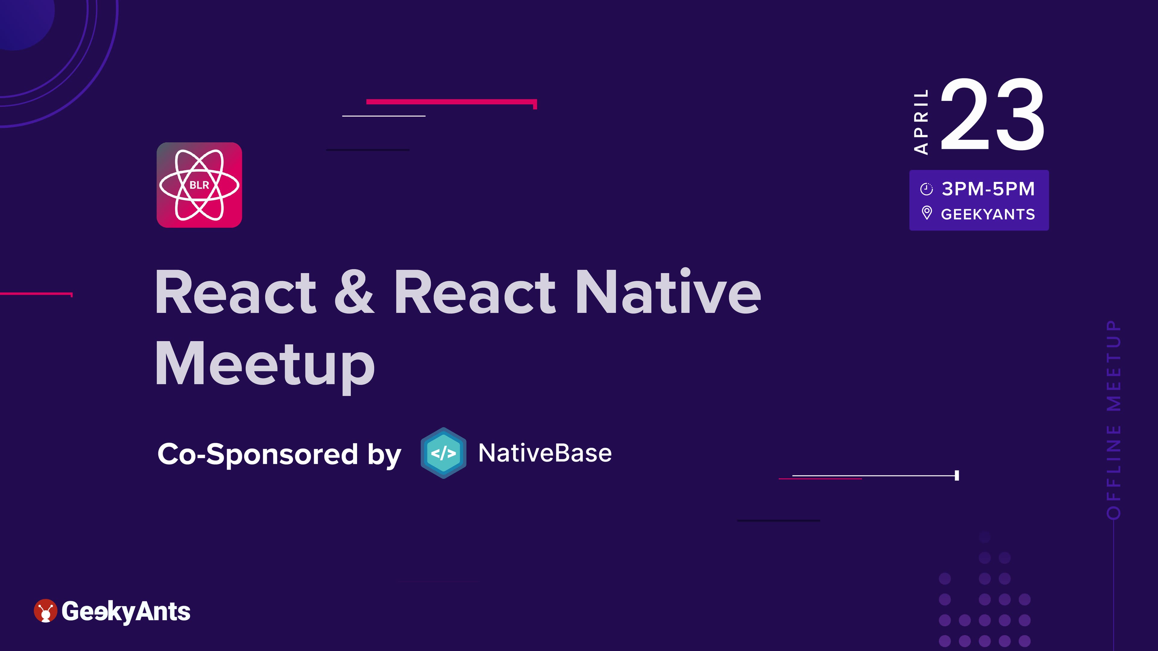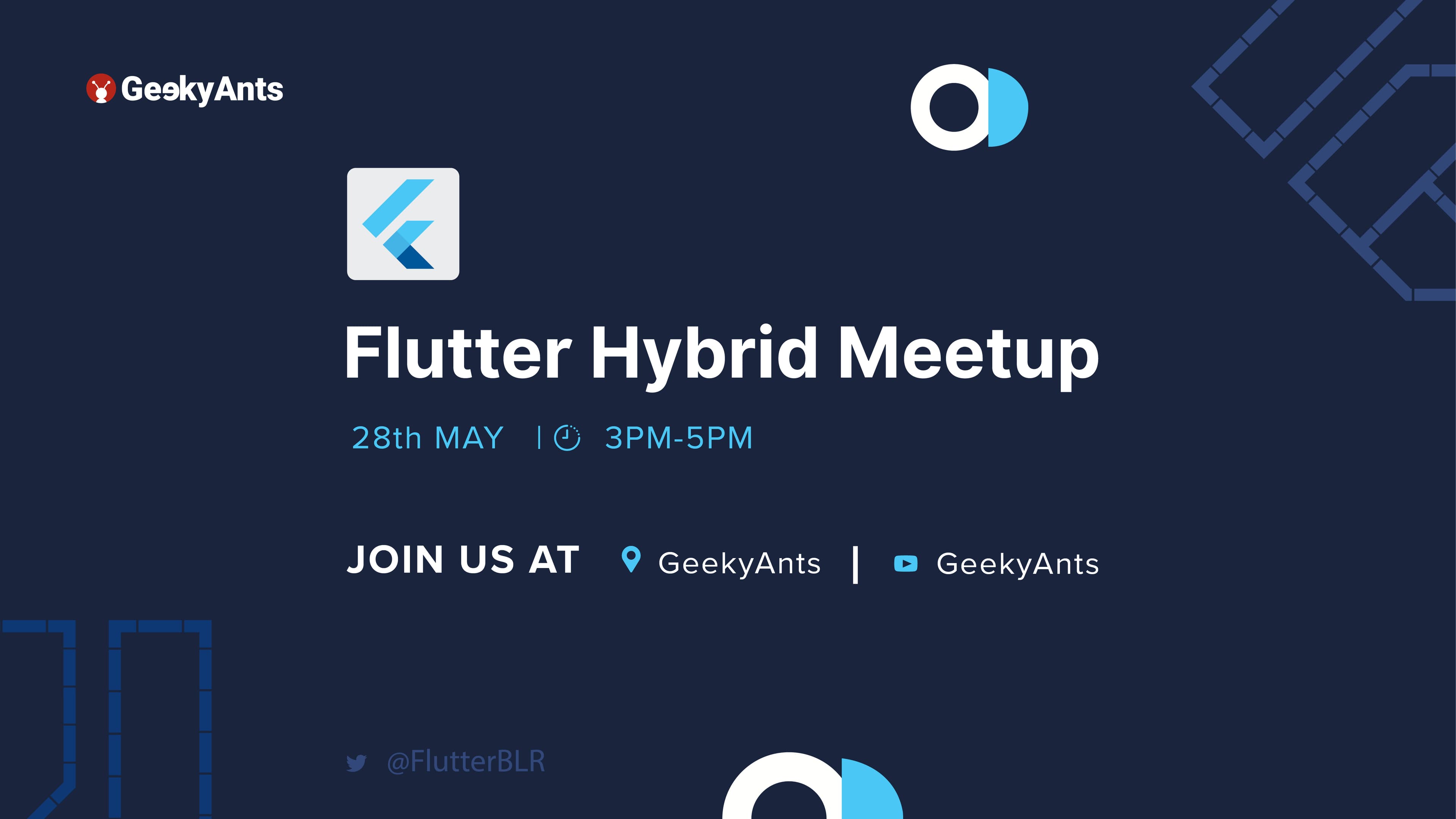 We are organizing Flutter Hybrid Meetup at the GeekyAnts office on 28th May 2022 at 3 PM IST. As the name suggests, it will be a hybrid meetup, hence the speakers, audience and viewers can easily join the event either in-person(visiting the GeekyAnts Bangalore office) or remotely(via the GeekyAnts YouTube channel). Stay tuned for more information on the speakers and event agenda. Follow Flutter Bangalore on Twitter to stay updated.