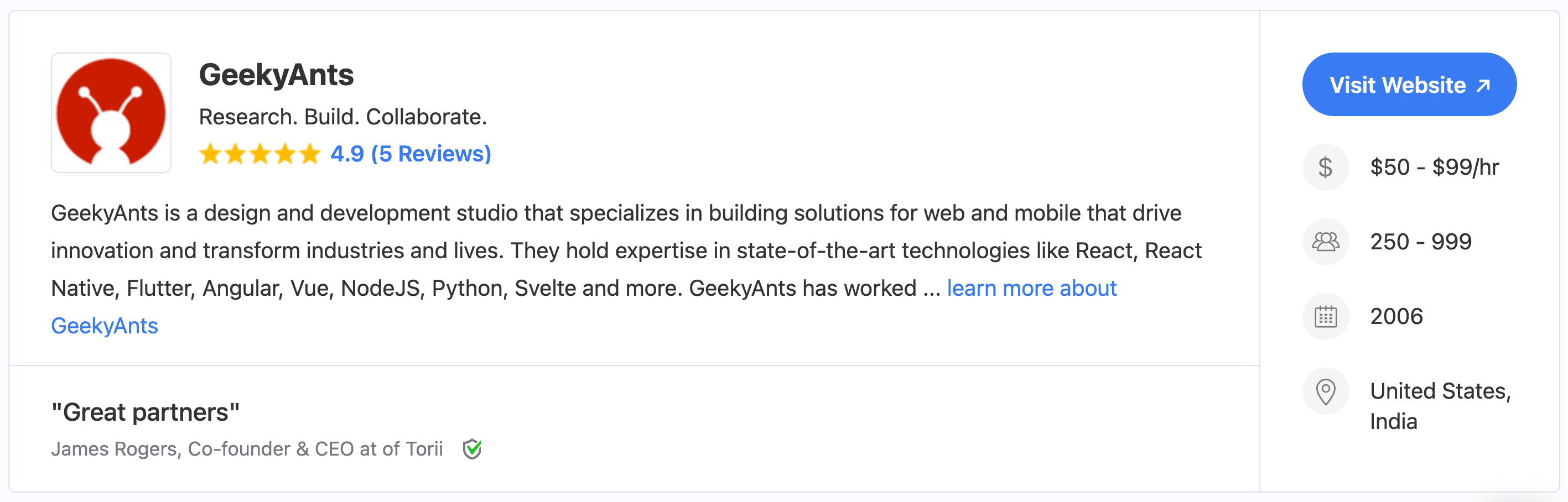 GoodFirms is a full-fledged research and review platform that helps software buyers and service seekers to opt for the best software or firm that helps in developing quality apps. In their recent report, GeekyAnts ranked 9 in the list of top mobile app development companies in 2022.
