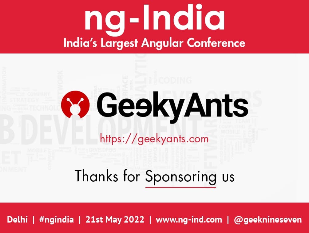 We are super thrilled to announce that GeekyAnts is also one of the sponsors at India's Largest Angular conference, ng-India. It is being held on 21st May 2022, in Delhi, India. Geeks Saurabh Srivastava, Manav Goel, and Neeraj Sinha will be attending the conference representing GeekyAnts. If you'll be attending as well, don't miss to say hello to our geeks.