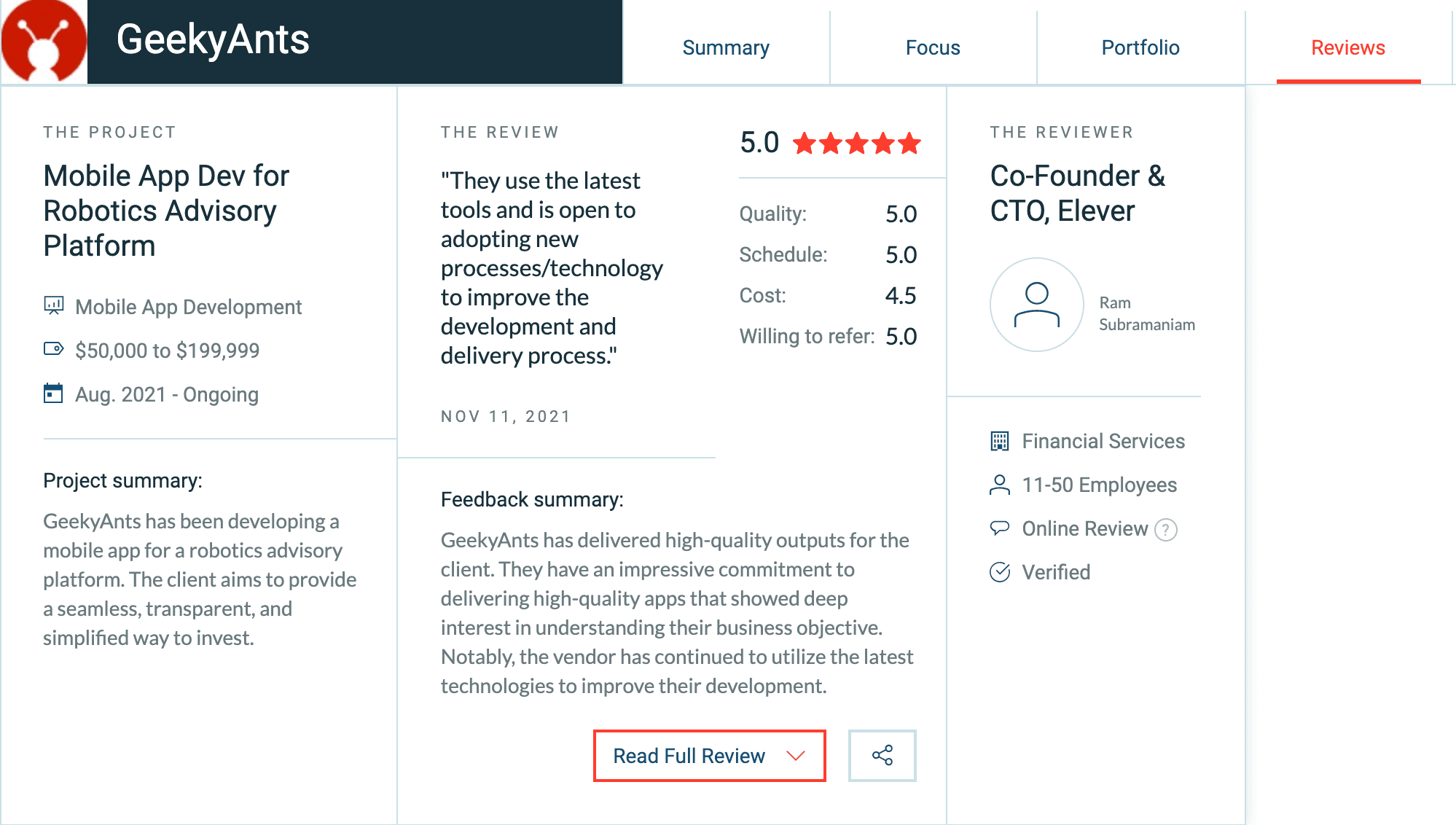Elever's co-founder and CTO, Ram Subramaniam gave us a 5-star rating with words as kind as themselves that "GeekyAnts delivered high-quality products and is open to adopting new technologies."