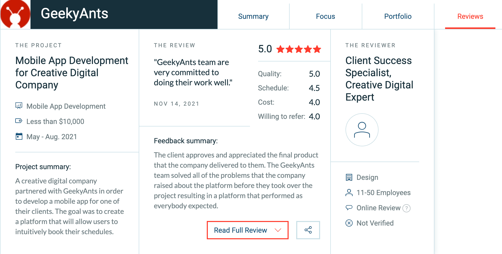 Client Success Specialist of Creative Digital Company, said: “GeekyAnts team is very committed to doing their work well.” They appreciated our work as the team resolved all their problems resulting in them giving us a 5-star rating! Kudos to the team, keep up the good work!