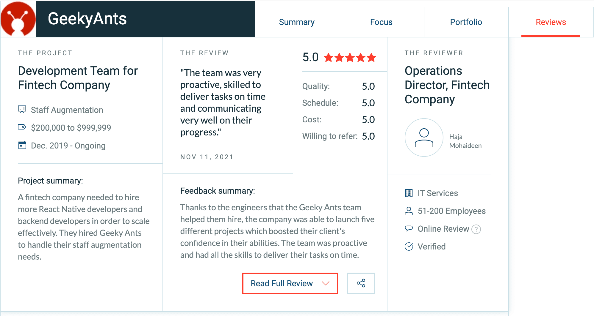 Haja Mohaideen, Operations Director of Fintech Company, stated that team GeekyAnts was very proactive and skilled at completing projects on time. He then proceeded to give GeekyAnts a 5-star rating!