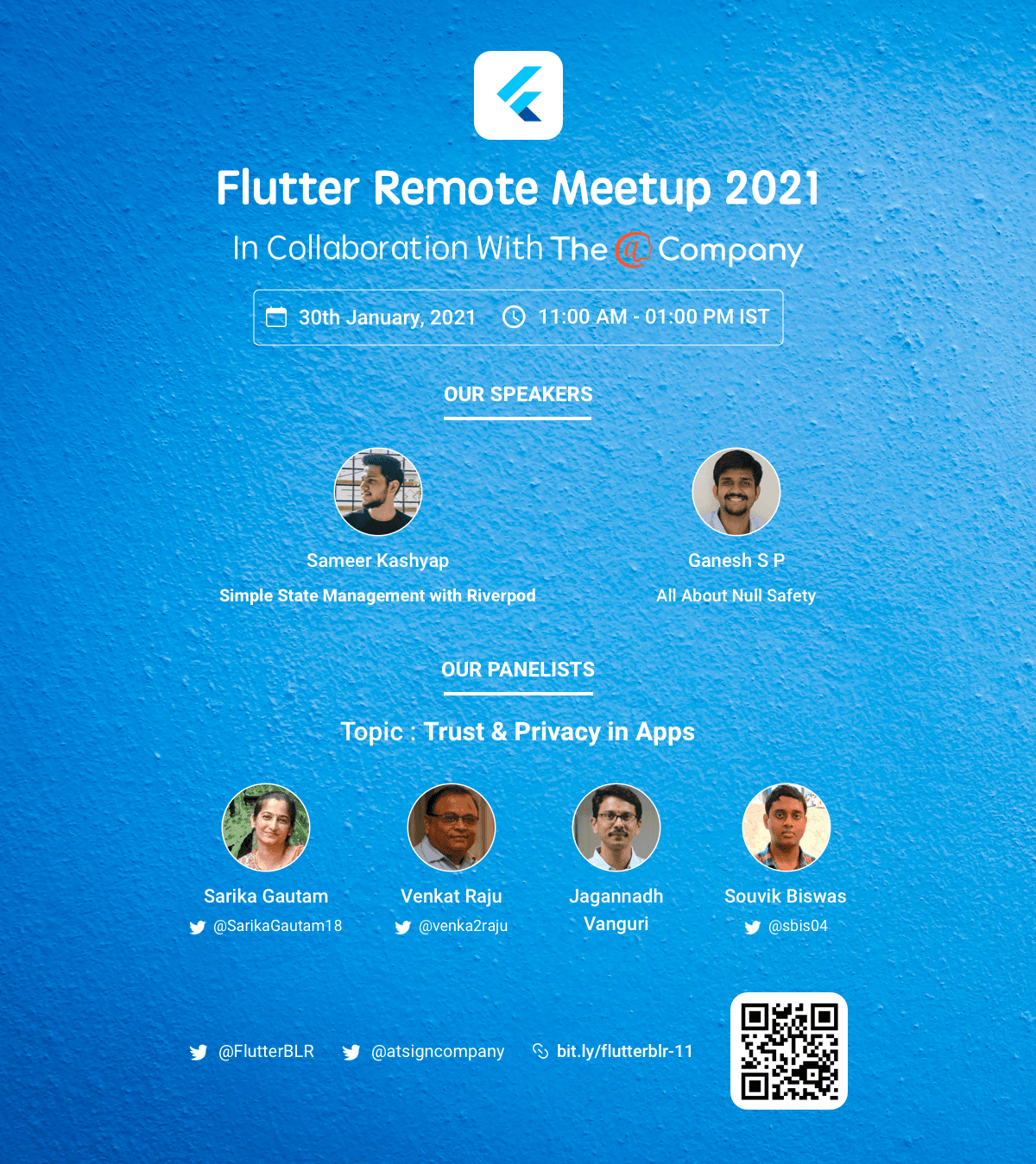 We're super excited for the first Flutter Meetup of 2021. Join us on tomorrow @ 11 AM for talks on State Management with Riverpod, Null Safety and a panel discussion on Trust & Privacy in Apps. Don't miss out!