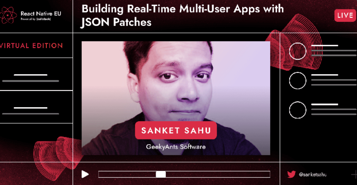 Sanket Sahu will be live and speaking on How to use JSON patches with React Native to build a framework for real-time multi-user apps tonight on the virtual React Native EU conference Day 2 at 9:15 PM IST.