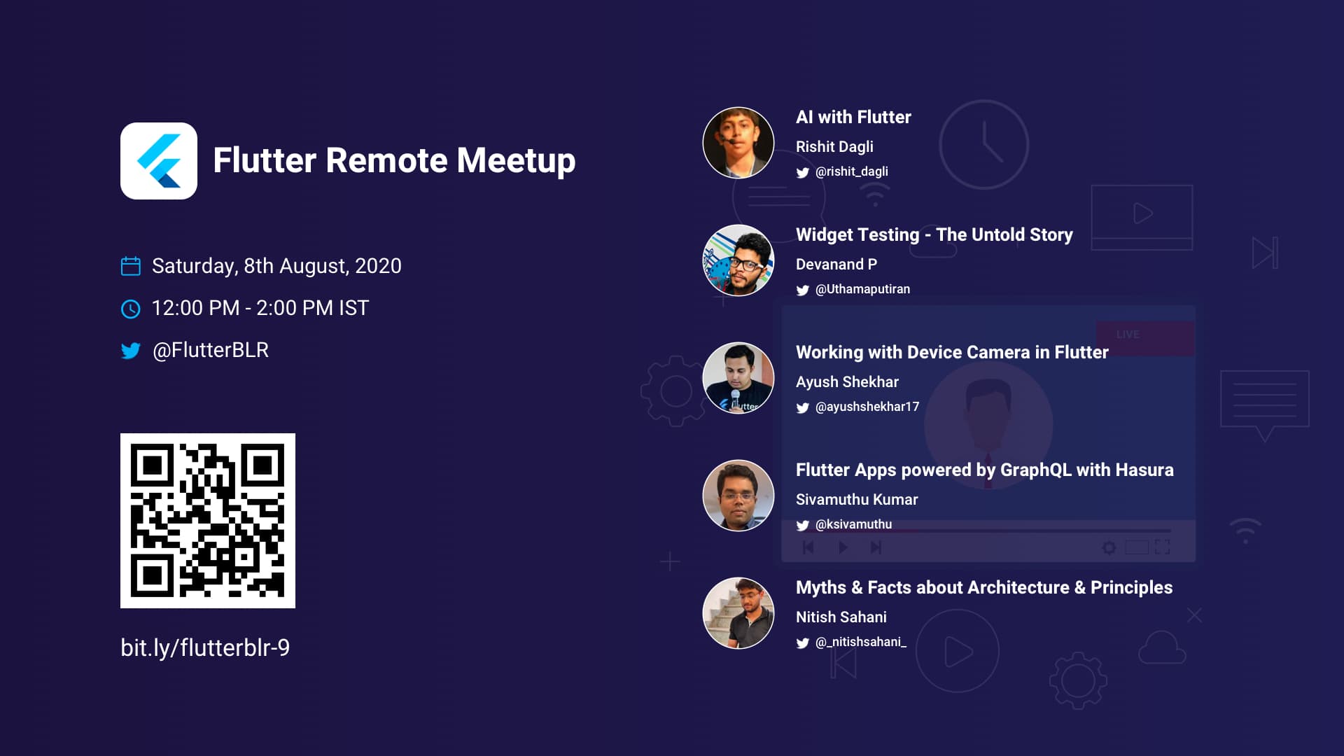 The much anticipated Flutter Remote Meetup is tomorrow (8th August, Saturday) at 12:00 PM IST. There is an amazing lineup of speakers with topics that you would want to listen to and have discussions about.